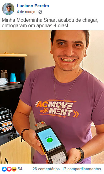 “Para mim não teve invenção melhor, é delicada, prática, aceita todo tipo de cartão, não precisei ter nome limpo, levo para todos os lugares e no final do meu dia ainda tem bateria o suficiente, me atende muito bem!”